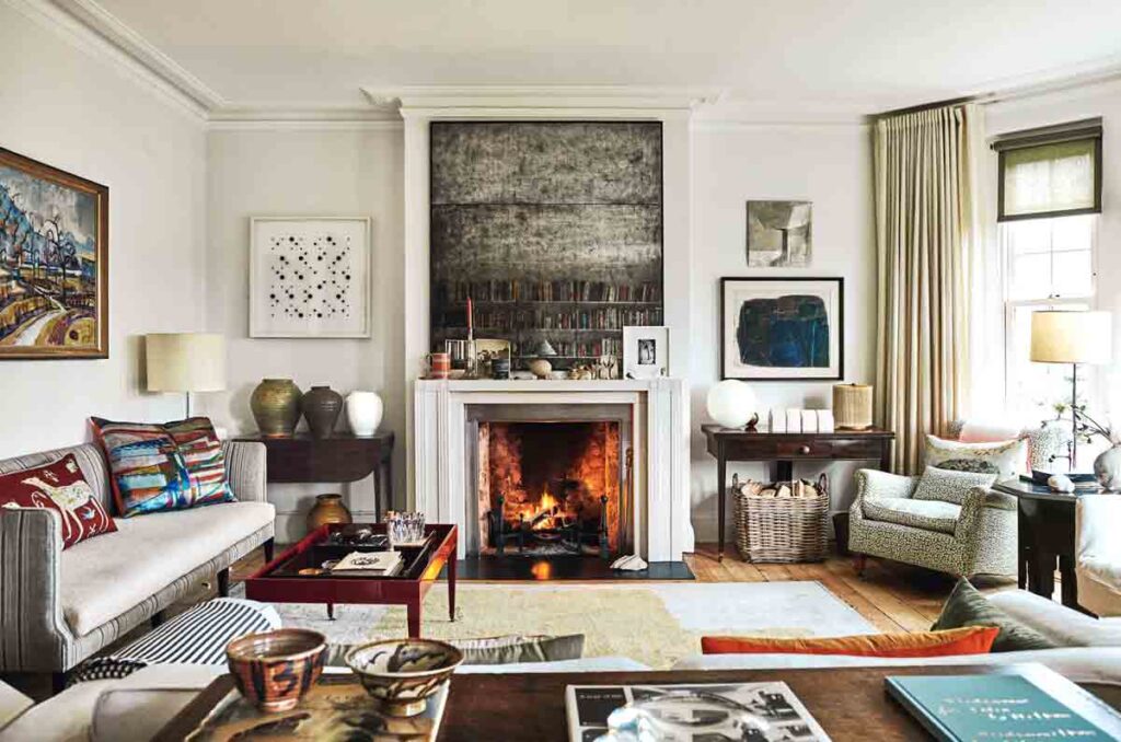 Considera poner algunas carpinterías y estanterías que te ayuden a aprovechar al máximo la altura de la habitación y proporcionar un valioso espacio de almacenamiento . Si tienes la suerte de tener una chimenea , conviértela en un punto focal, organizando tus sofás y sillas frente a ella y decorando la repisa de la chimenea con cuadros y adornos.